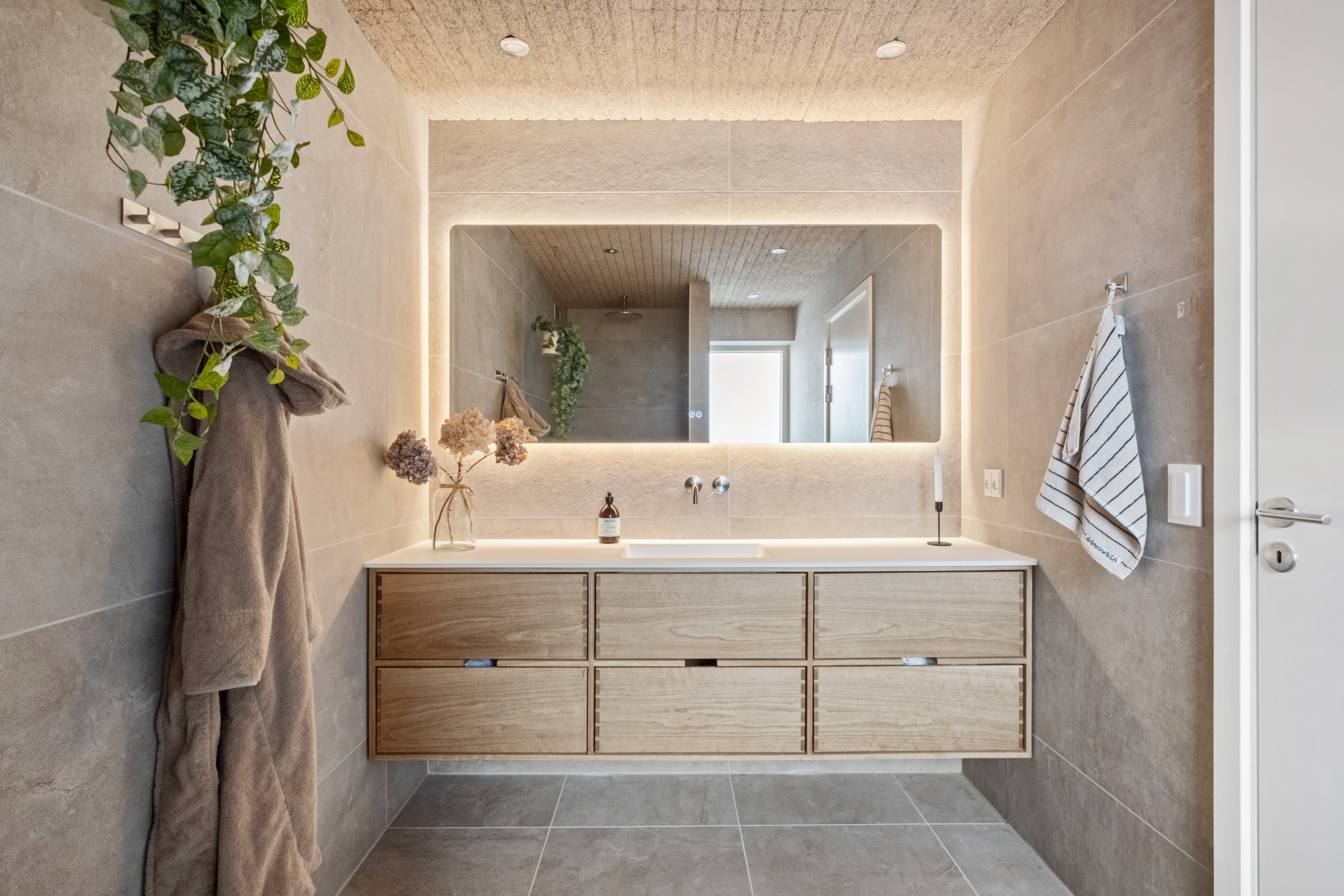 En fuld flisebeklædning skaber en wellness-lignende ro, mens det bagbelyste spejl tilfører et raffineret og eksklusivt lys.