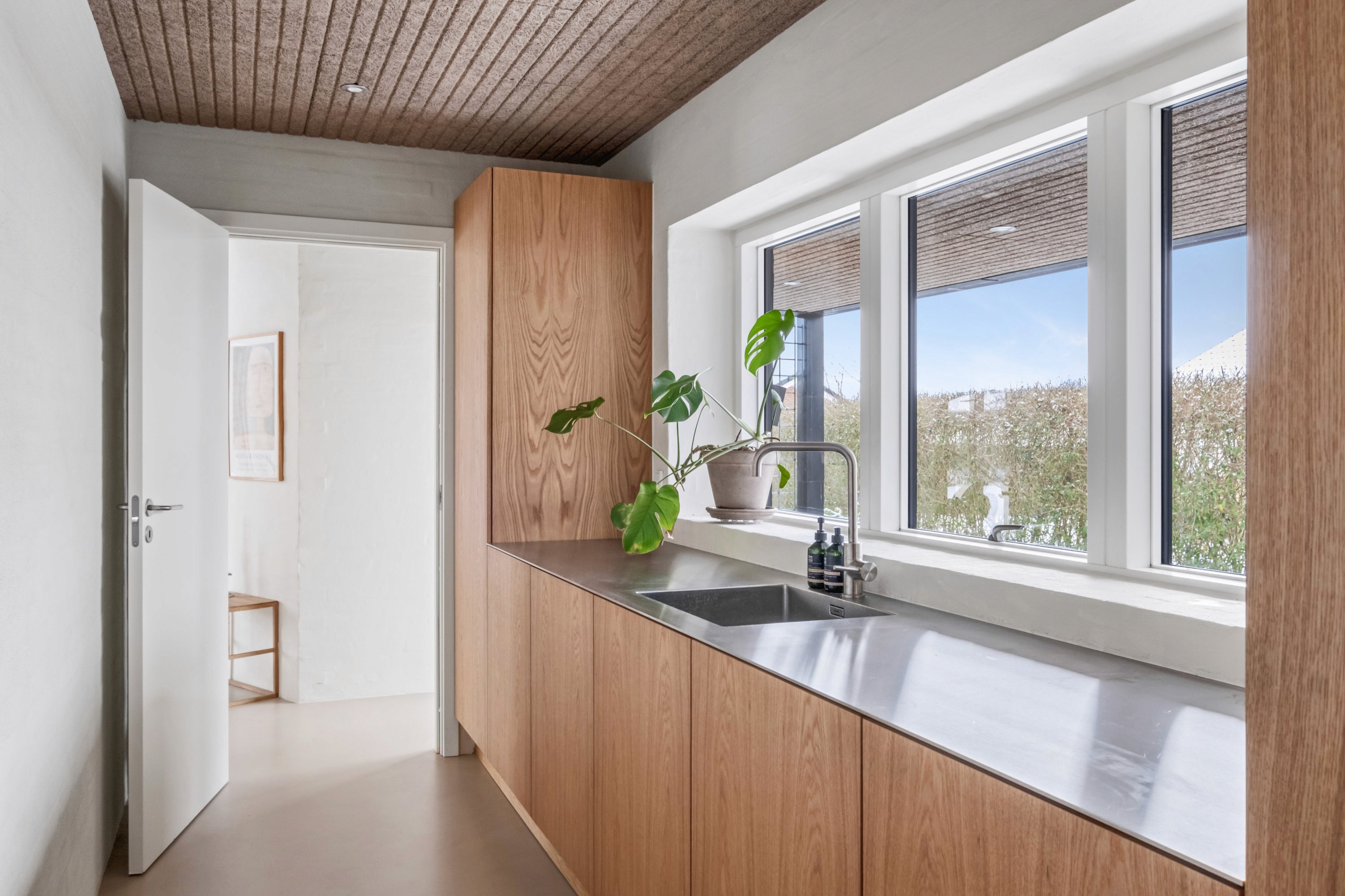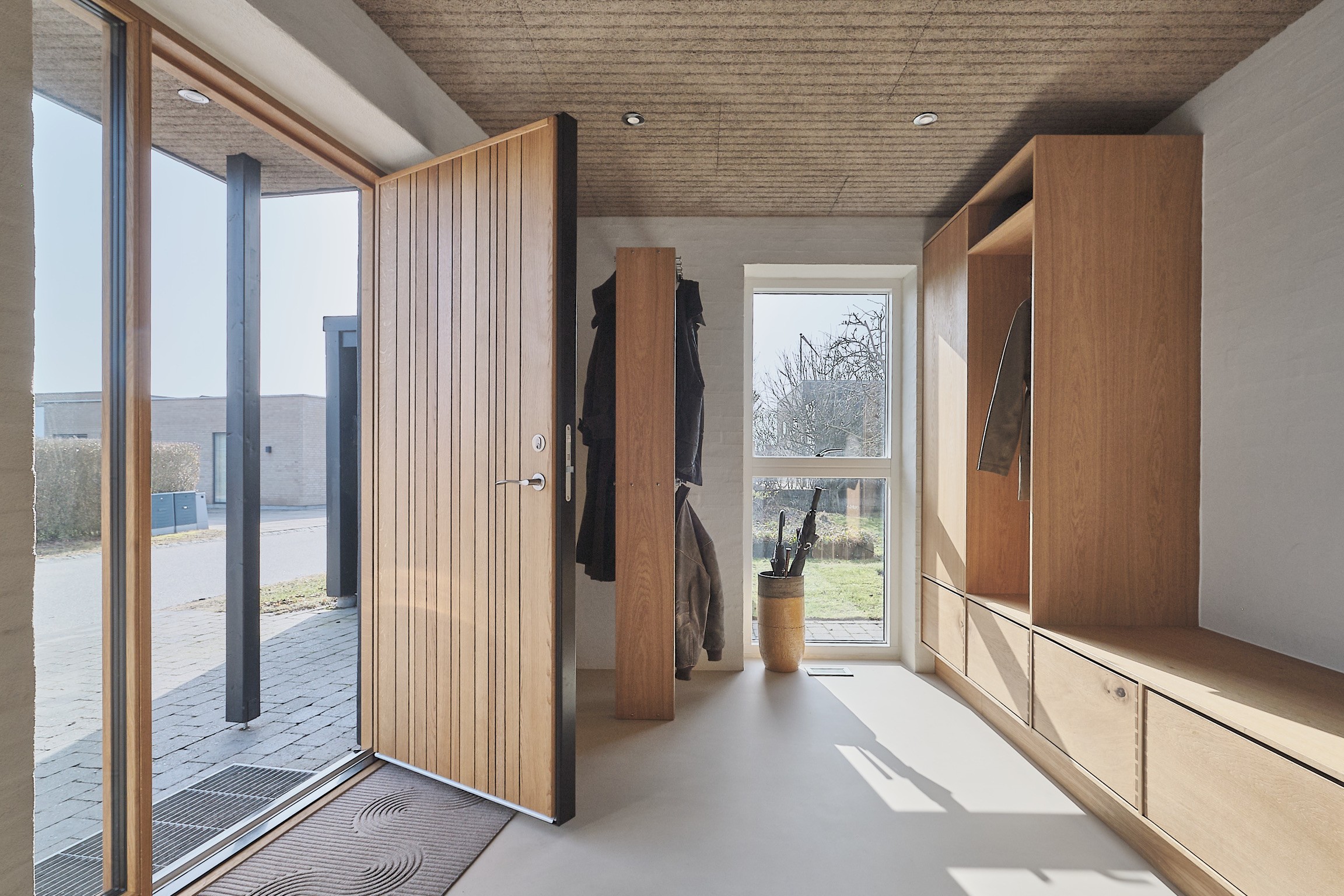 Gennemgående materialer og detaljer fra køkken til badeværelse og bryggers skaber en sammenhængende rød tråd i hele boligen.En hoveddør i egetræ, specialdesignet entrémøbel og vægmonteret stumtjener definerer entreen og etablerer en klar retning for boligens samlede udtryk.